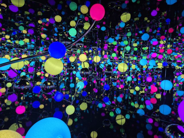 草間の代名詞である水玉模様は、自己と宇宙のつながり、そして無限の反復を象徴する。彼女の代表作「インフィニティ・ミラー・ルーム」では、光と鏡が織りなす幻想的な空間に包まれ、永遠を感じさせる体験をした。