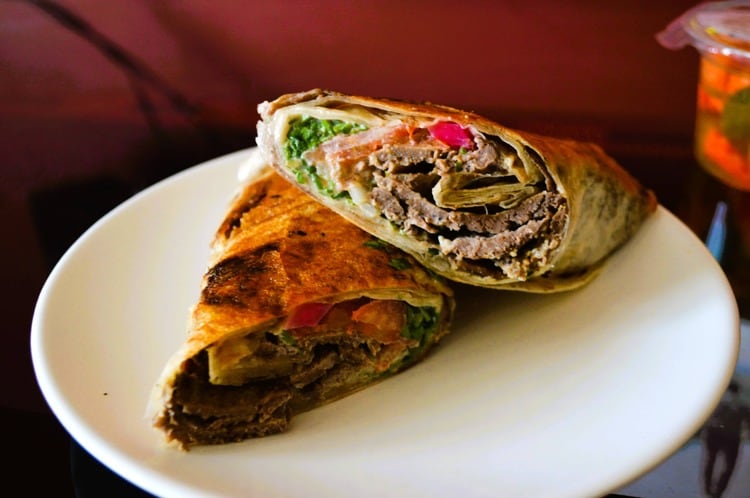 こちらは少し高級なカフェで頼んだシャウルマ。味は美味しいですが、シャウルマはストリートフードなので、やはり屋台風のシャウルマ専門店で頼むのが一番 ー 筆者撮影美味しいシャウルマ屋さんは「人だかり」が目印
