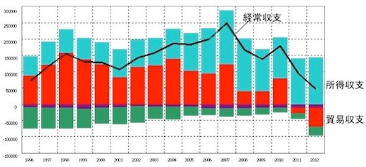 図のように2012年の貿易収支は5.8兆円の赤字だ。所得収支(投資収益や海外子会社からの配当など)の黒字が14.3兆円なので、経常収支は4.7兆円の黒字になっているが、ここ5年で黒字は1/5に激減しており、あと数年で経常収支も赤字になるおそれが強い。変動相場制は本来、経常収支が赤字になると為替レートが下がって貿易赤字を減らすように設計された制度なので、円が下がるのは当然である。