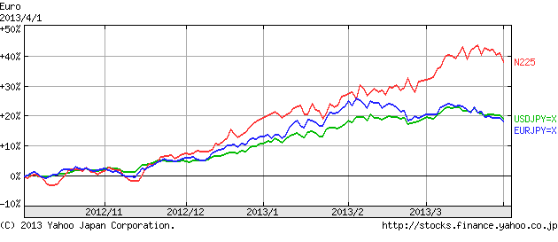 上の図のように、昨年10月からユーロ(青)が上がり、それにつられてドル(緑)が上がり始めたあと、自民党の安倍総裁が「日銀がお金を配れば景気がよくなる」などと言い始めたため、12月から急に株価が上がり始めた。今年2月までの日経平均の動きは、ユーロ/円レートにほぼ連動している。