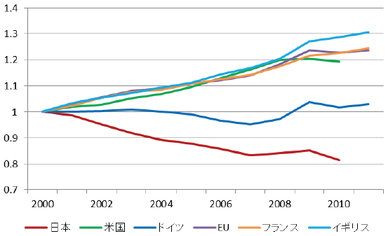 これに対して欧米では労働組合が賃下げを許さないため、インフレが続いているが、2008年の金融危機以降は、世界的に物価上昇率が下がり、デフレ傾向が強まっている。価格の低下は図2のように世界的な傾向で、金融危機のあと過剰債務の削減でデフレになった日本は、世界に先んじて賃下げで新興国との競争条件を強化した「トップランナー」と見ることもできる。