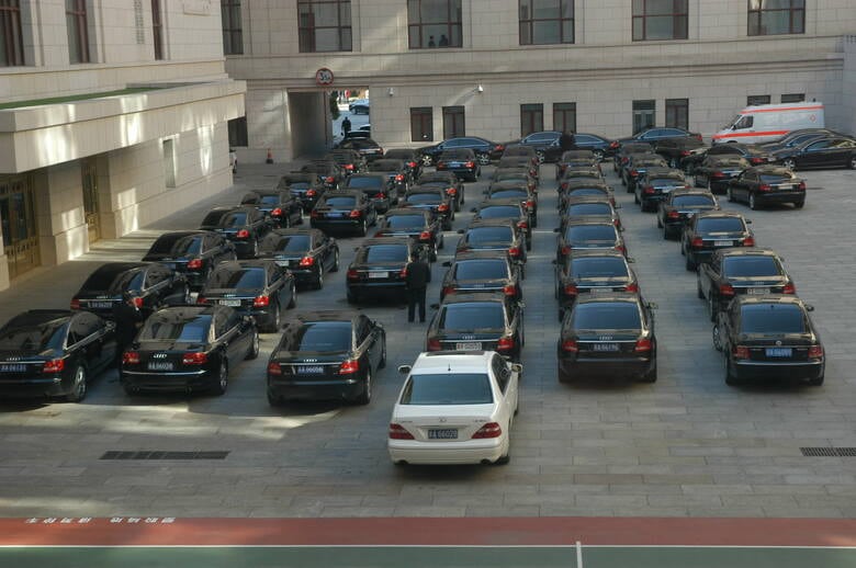 人民大会堂内にずらりと並んだ要人の車。ほとんどが高級外車だ (c)Nagaoka Yoshihiro