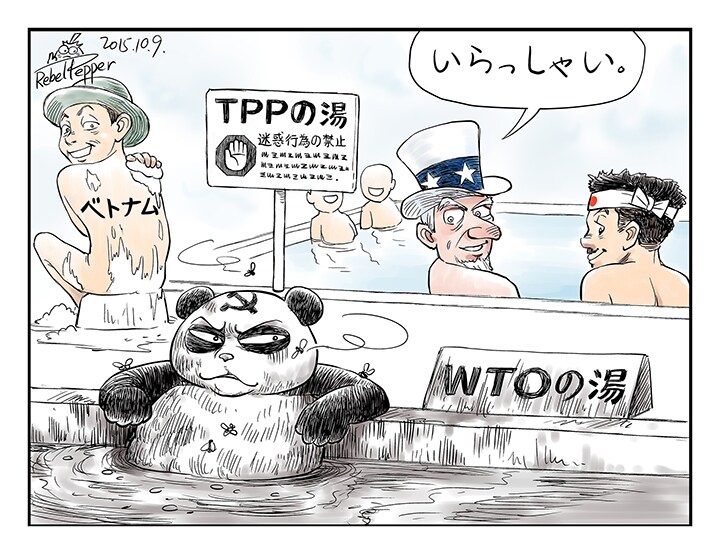 中国をWTOに受け入れるにあたって、異議を唱えた国は少なくない。長年の中国との付き合いから、彼らは中国を受け入れることが誤りだと考えた。中国は約束をいったんは受け入れるが結局は守らず、国際経済に面倒をもたらす、と知っていたからだ。このような考えからシンガポール、ニュージーランド、ブルネイ、チリの4カ国は、さらに高い基準も持ち、敷居も高い自由貿易協定であるTPP(環太平洋経済連携協定)をつくり出した。中国が国際経済の中でゴジラのような破壊者になるに従い、アメリカは中国のWTO加盟を支持したことを後悔したのか、何とか解決の道を探し始めた。アメリカはTPPに加盟後、すぐにこの小さな経済組織にまったく新しい意味を与え、さらに多くのアジア・太平洋国家に加入をうながし、さまざまな障害をすみやかに克服してついに10月5日に合意に達した。