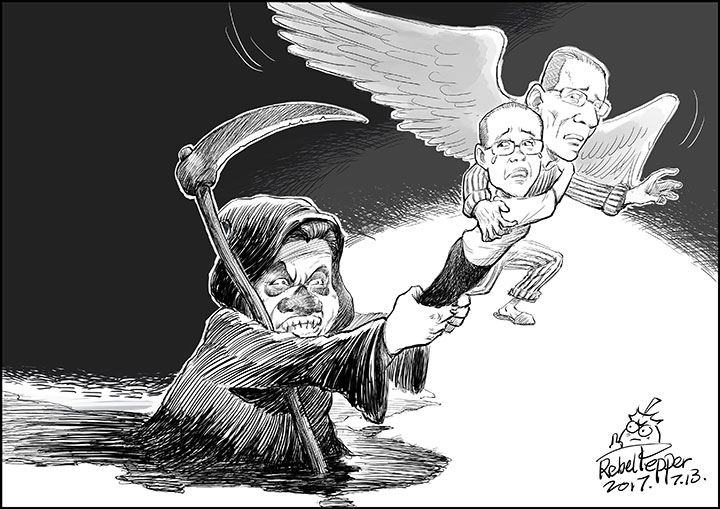漫画を描き終わり、このコラムを書いている今、劉暁波はすでに危篤状態になっている。数日前、共産党はようやくドイツとアメリカの専門家の検診を許したが、依然として彼らが専用機で劉暁波を国外に移すことは拒絶した。ドイツで開かれたG20で、独首相のメルケルは何度も習近平に向かって劉暁波の釈放を希望する、とお願いしたそうだ。習の回答は帰国した後に会議を開いて検討する、というものだった。