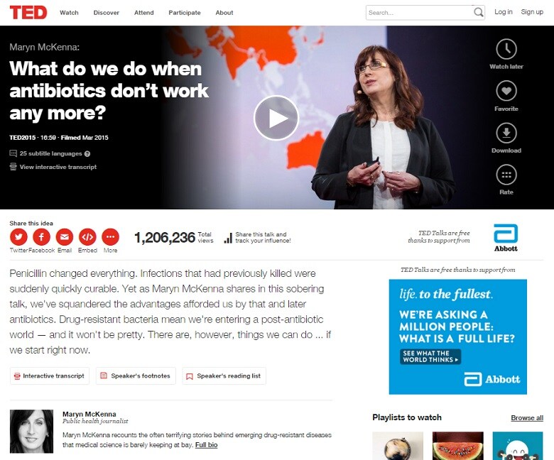 しかし、抗生物質で懸念されるのは、耐性菌が増加しているという点である。現在、世界で年間70万人もの人が抗生物質の効かない感染症により死亡しており、この傾向が続けば、2050年にはその人数が1000万人にのぼるという。抗生物質が効かなくなってきた理由、そして、まったく効果がなくなる日の到来をどうやって遅らせるかの具体的な対策について、マッケーナ氏はこのTED Talkでわかりやすく説明している。彼女の話を聞くと、自分の習慣を変えようという気になり、政府や医学界、農業界の行動改善も望むようになるだろう。