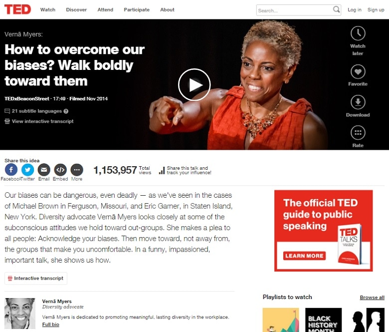 それを踏まえ、黒人女性コンサルタントのヴァーナ・マイアズが、自身のメッセージを広く伝え知ってもらおうと、このTED Talkを行った。マイアズ氏は、人が無意識的な偏見を自覚することでその偏見を乗り越えるという方法を教えている。彼女が指摘している黒人男性に関する偏見は日本人でも持っているかもしれないし、彼女が提案している考え方は様々な「自分と違った人」に対しても応用できる。そういった点で非常に示唆に富んだ内容となっている。