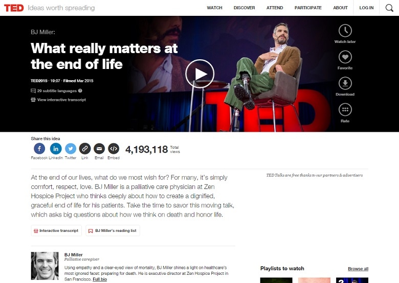 BJ ミラー氏は大学の時に事故で半死半生の目に遭った経験から、緩和医療を専門とする医師となり、今はホスピスで働いている。このTEDトークでミラー氏は、終末期にある患者のケアで足りないところを挙げ、それをどうやって変えられるかについて考えを述べている。