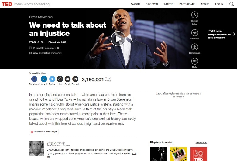アメリカで人種問題がニュースになっている現在、これはタイムリーなテーマだと言える。だがそれだけでなく、スティーブンソン氏の物語を語る優れた能力によって、このTEDトークは彼の祖母、著名な人権活動家のローザ・パークス、そしてある裁判所で働く管理人といった人物を生き生きと描き、観客を引きつけるトークとなっている。