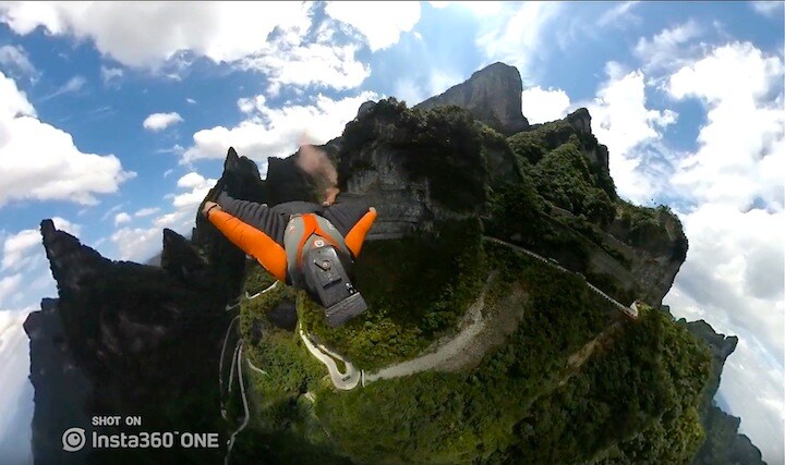 しかしInsta360 Oneの簡易バレットタイムでは、ヒモや自撮り棒の先に本体を取り付けて円を描くように頭上で回すだけで、自動的にヒモや棒が消去されて撮影者中心のスローモーション動画が作られる。まさに、究極のセルフィービデオの出来上がる仕組みだ。