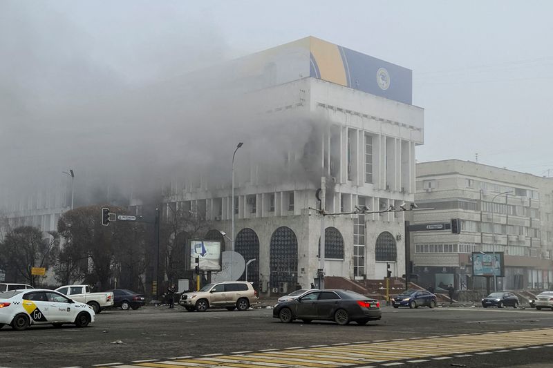 1月14日、暗号資産(仮想通貨)ビットコインの採掘業者にとって「天国」だったカザフスタンが、その輝きを失うかもしれない。写真は主要都市アルマトイで6日、抗議デモを受け煙を上げるTV局などが入居するビル(2022年 ロイター/Mariya Gordeyeva)