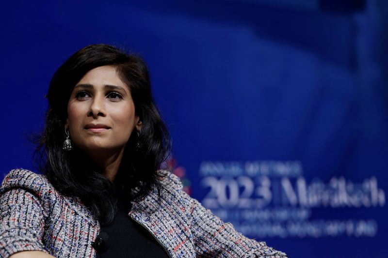 IMFのギータ・ゴピナート筆頭副専務理事は20日、米国は高水準の財政赤字を削減するために歳入を増やす必要があるとの認識を示した。モロッコ・マラケシュで昨年10月撮影(2024年 ロイター/SUSANA VERA)