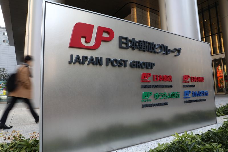 4月23日、日本郵政グループのかんぽ生命保険は2025年度の一般勘定資産の運用計画を公表した。写真は都内の日本郵政グループの看板。2020年2月撮影(2025年 時事通信)