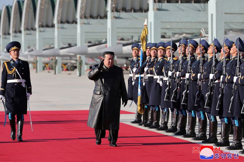 12月1日、北朝鮮の金正恩朝鮮労働党総書記は朝鮮人民軍に対し、敵のあらゆる挑発にも即応できる態勢を取るよう指示した。国営の朝鮮中央通信(KCNA)が1日伝えた。写真は空軍司令部を訪問する金総書記。同日公開された、KCNA提供写真(2023年 ロイター)