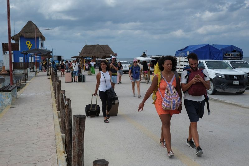 10月8日、「カテゴリー4」のハリケーン「ミルトン」は同日に勢力を強める見通し。写真は自主避難命令を受ける住民や観光客ら。7日、メキシコ・ホルボックス島で撮影(2024年 ロイター/Paola Chiomante)