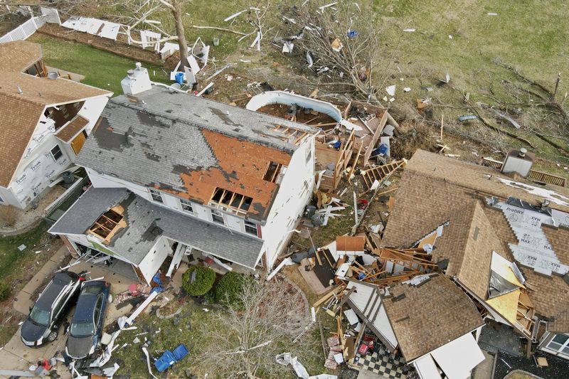 米南部や中西部で14日から15日にかけて竜巻や暴風が発生し、これまでにミズーリやアーカンソーなど6州で少なくとも36人が死亡した。ミズーリ州フローリッサントで15日撮影(2025年 ロイター/Lawrence Bryant)