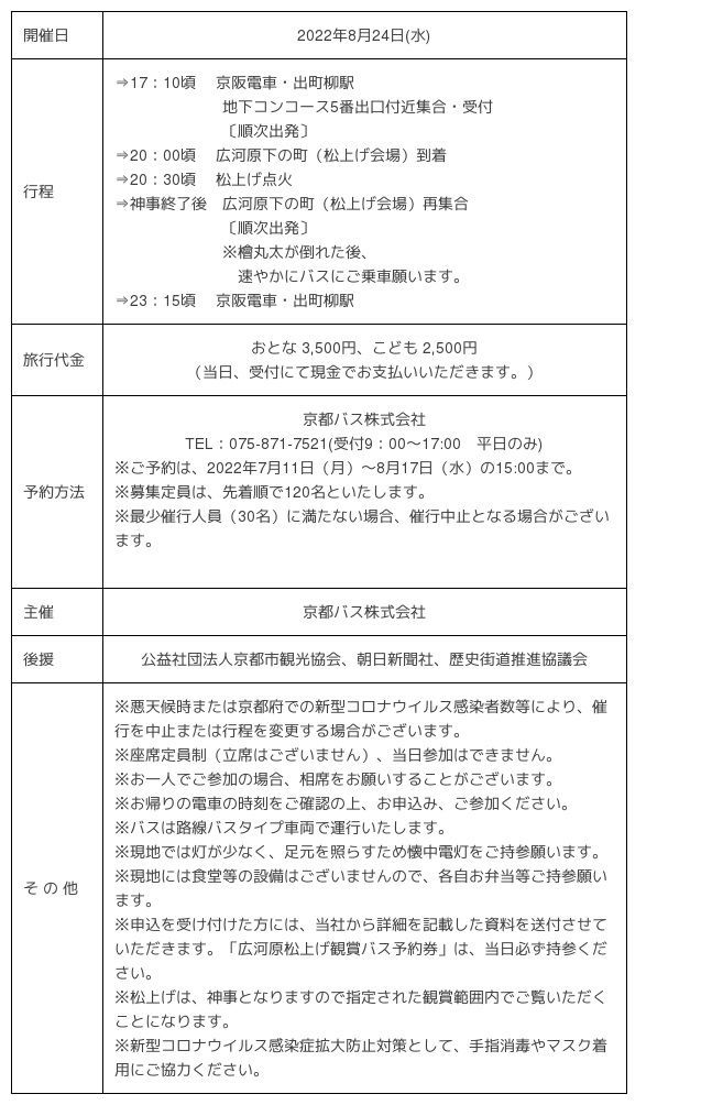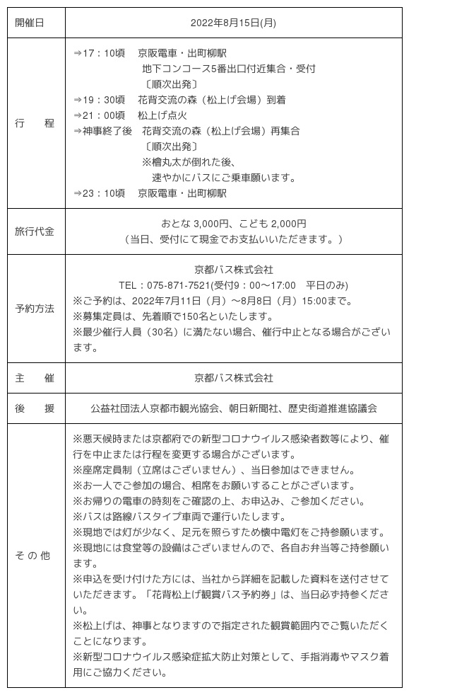 京都バス株式会社(本社:京都市右京区 代表取締役社長:吉本直樹)は、2022年8月15日(月)に左京区花背八桝町にて催される「花背松上げ」、2022年8月24日(水)に左京区広河原下の町にて催される「広河原松上げ」行事に合わせ、「観賞バスツアー」をそれぞれ企画・販売します。なお「花背松上げ」「広河原松上げ」は3年ぶりの開催となります。