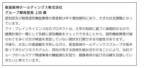 当社グループでは、医療機関、大学、企業などと連携し、沿線自治体等から「社会参加を軸とする介護予防プログラム」等を受託しており、その一環として実施している住民の健康計測では、アイ・ブレインサイエンス社の「MIRUDAKE(R)」を活用した認知機能評価も提供しています。今後も、同社とのさらなる協業を通じて、健康寿命の延伸とQOL(Quality of Life)の向上により一層取り組んでまいります。