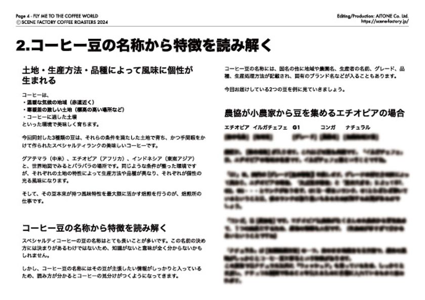 SCENE FACTORY COFFEEの代表であり、アドバンスドコーヒーマイスターである篠田が執筆する、毎月異なるテーマのマガジンが付属。最初の4ヶ月の基礎編と、それ以降の応用編に分けられており、コーヒーのことを全く知らない人でも、少しずつコーヒーの知識を深めることができます。