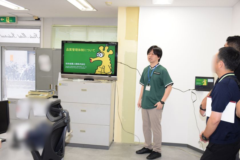 イケキン代表取締役 武井よりご挨拶を申し上げた後、倉庫・ショールーム・試験室・品質管理室を見学していただきました。