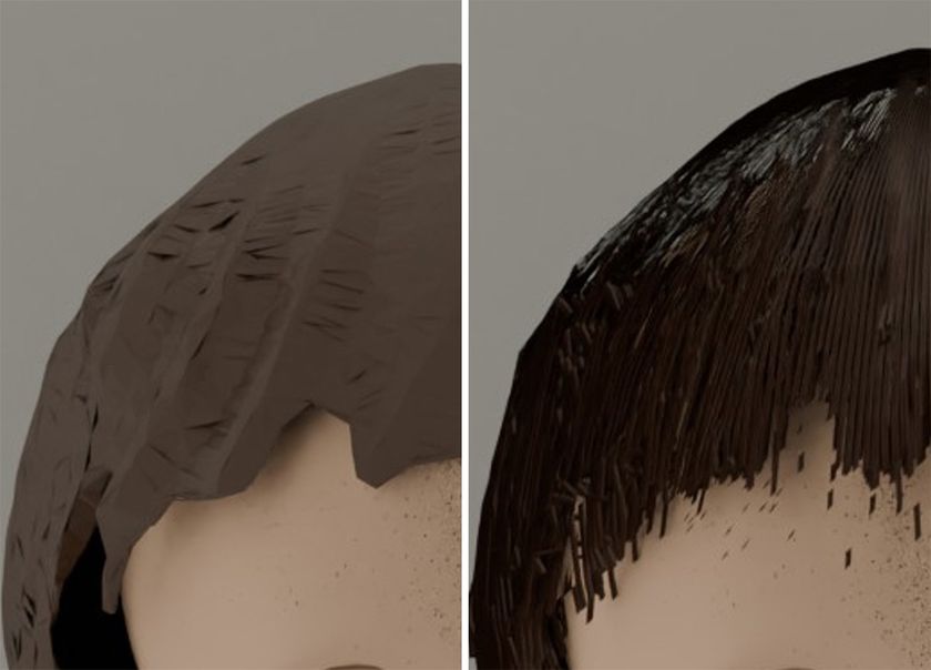 従来方式で再現したアバターの頭髪(左)と、本技術により再現した高精細なアバターの頭髪(右)