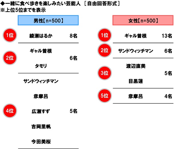 ■一緒に食べ歩きを楽しみたい芸能人 男性回答1位「綾瀬はるかさん」、女性回答1位「ギャル曽根さん」