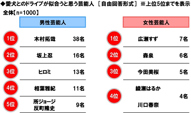 ■愛犬とのドライブが似合うと思う芸能人 男性芸能人1位「木村拓哉さん」、女性芸能人1位「広瀬すずさん」