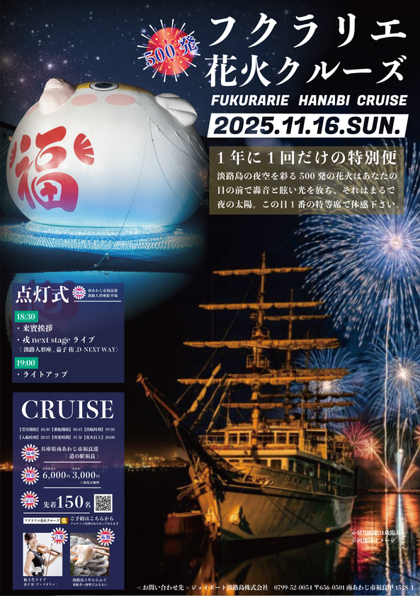 淡路島・福良のブランド食材「淡路島3年とらふぐ」の豊漁を祈る、福いっぱいのお祭り「フクラリエ」は、冬の淡路島エリアにおいて目玉となるイベントです。巨大ふぐバルーン「100年とらふぐ」がライトアップされるフクラリエの初日を飾るスペシャルイベント! 普段はうずしおクルーズとして活躍する遊覧船が、この日限りの特別便として出航します。