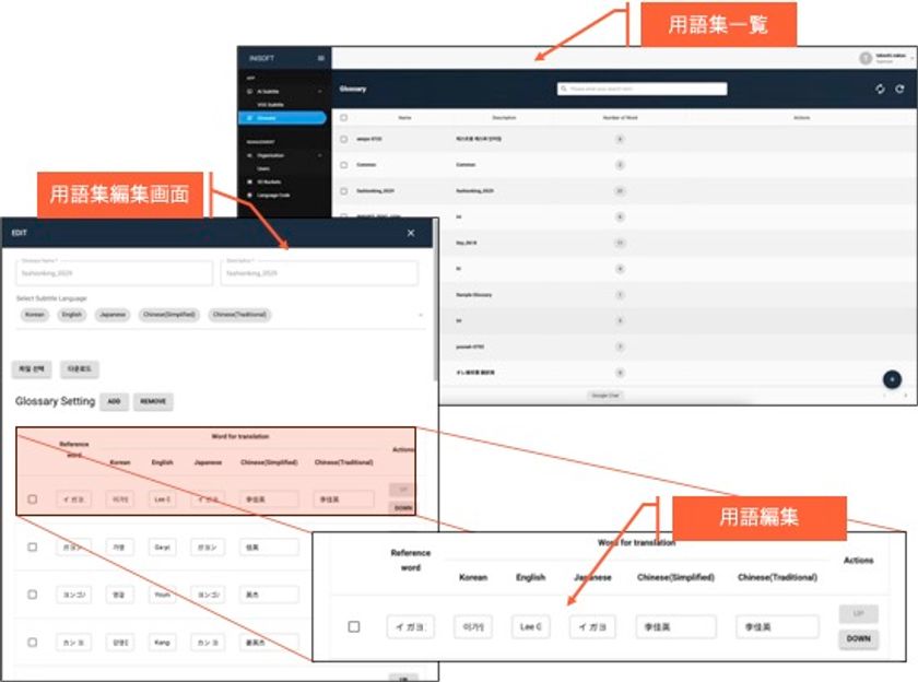 また、人名など発話された音声から正しく変換されない可能性がある単語に関して、イベントごとの単語辞書(用語集)を作成、登録することで、AIによる誤認識、誤翻訳を防ぐことが可能です。