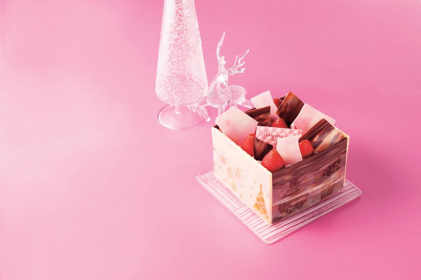 宝石箱をイメージしたスクエア型の土台に、パリッとした薄いチョコレートや真っ赤ないちごをトッピング。