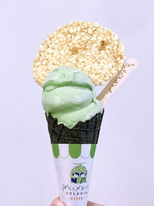 ぼくとメロンとソフトクリーム。からは、人気のメロンソフトにおこげ煎餅をトッピングした今までなかった商品が新登場!おこげ煎餅のほのかな塩味とクリスピーな食感にメロンソフトの華やかな甘さが一体となった、お米のシーズンならではの季節限定商品です。奇跡のマリアージュをぜひ味わってください。