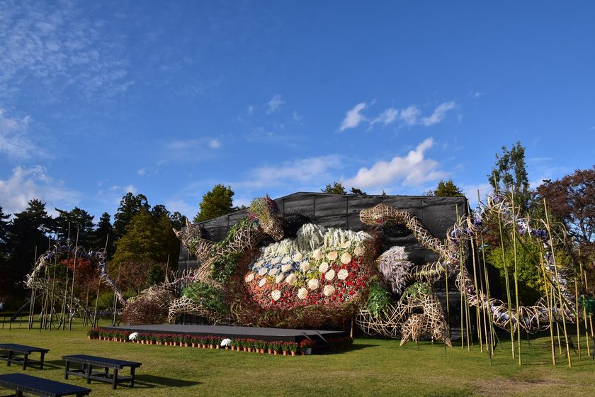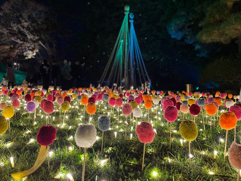 丸い菊の花ピンポンマムをモチーフにした毛糸でできた「ぽんぽんマム」が三の丸庭園を敷き詰めます。