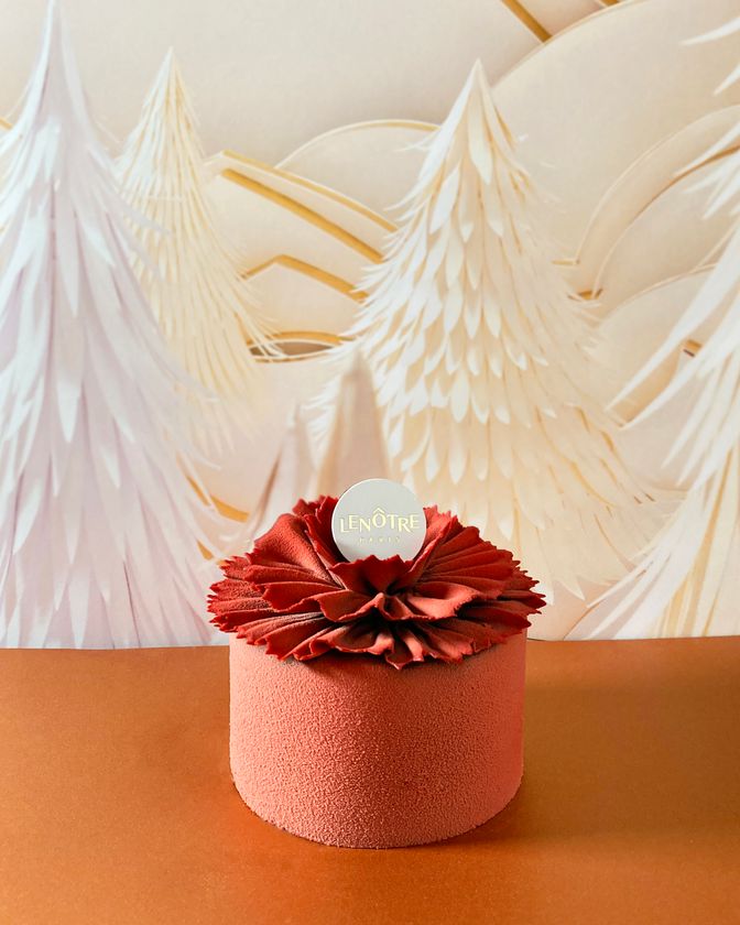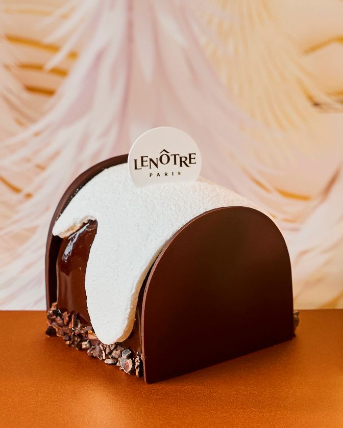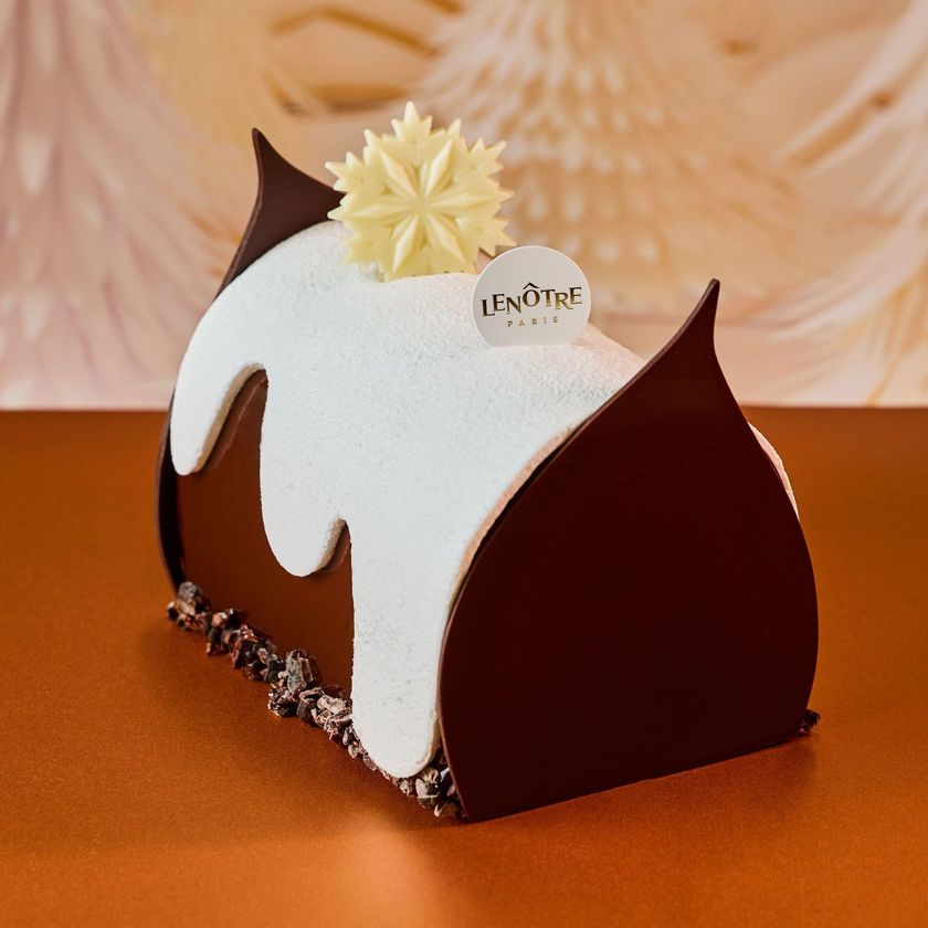 カカオ70%チョコレートとキャラメルのムース、軽やかなミルクチョコレートムース、カカオシロップを含ませたしっとりとしたビスキュイ・ショコラ、2種類のナッツを使用したチョコレートクランチなど、7層を重ねました。ギモーブで雪化粧したクリスマス限定のケーキをお楽しみください。