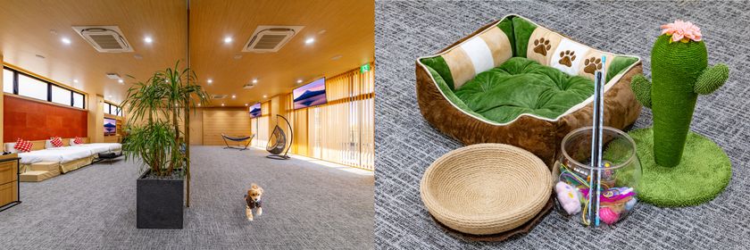 客室は、ワンちゃん・ネコちゃんもビックリのビッグサイズ(県内最大級180m2:15m×12m)。しかも、施設内のケージによる制限もございません。愛猫とのご滞在を思う存分、ご堪能ください。