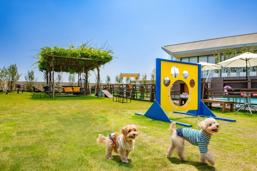 有明海を一望できる庭園には、ワンちゃんが元気に駆け巡ることができる天然芝の屋外ドッグランを島原半島で初めて完備。(屋外330m2)※ワンちゃん専用です。