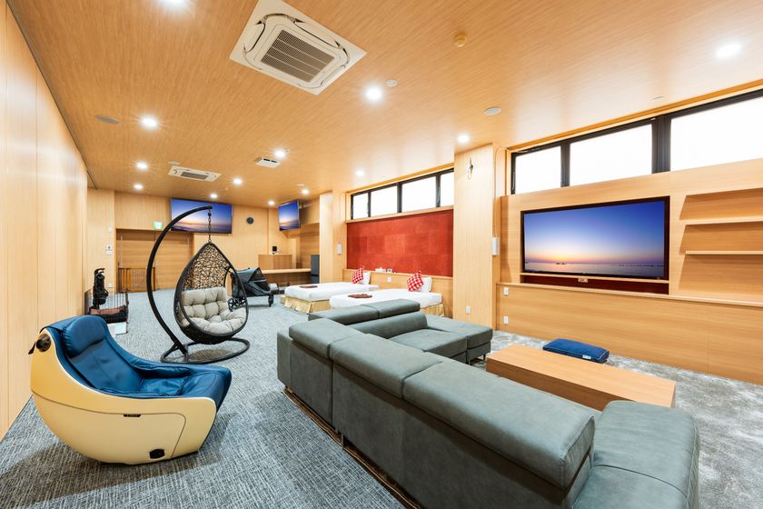 大型テレビ75型・金庫・エクストラベッド・マッサージチェア・ハンモック・ドライヤー・冷蔵庫・電気ケトル・空気清浄機完備・ワンちゃん用カート