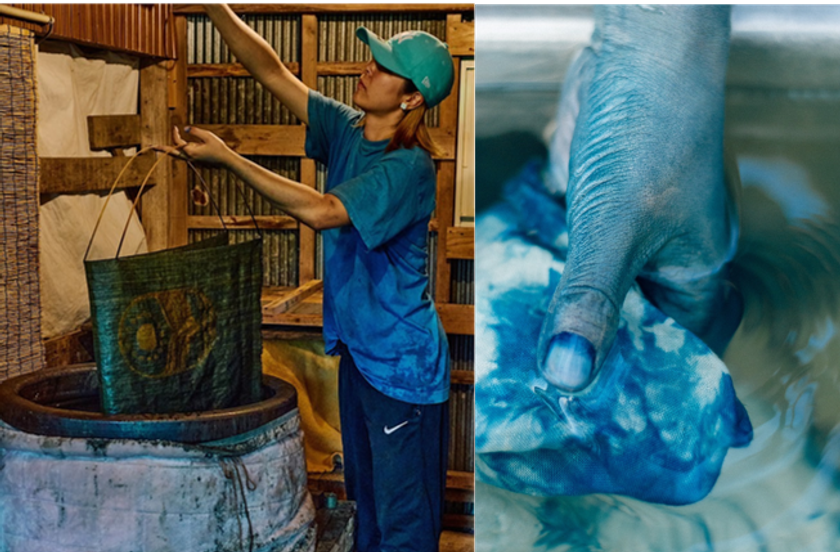 環境問題に対して自分にできることを追求した先で、藍染に出会ったという品田氏。「蒅(すくも)」や木灰由来の「灰汁」など自然の恵みだけを材料に、微生物の力で染め上げる技法は、使い終えた染め液さえ堆肥として活用することが可能な、まさに"究極の循環型"です。持続可能で環境負荷が少ないものづくりを通じて、個人でできるサステナブルライフを提案し続けています。