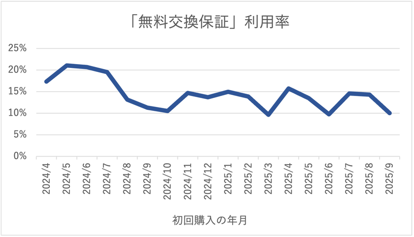 当社では、お届けした商品のサイズにご満足いただけなかった場合、ユーザー1人につき1回限り、サイズを変更しての再縫製・再納品を無料で行う「無料交換保証」を実施しています。上記6つの採寸方法が出揃った2024年4月以降に初めて購入を行ったユーザーにおいて、この無料交換保証の利用率はおおよそ10~20%の間を推移しており、改善の余地が認められます(2025年9月現在)。
