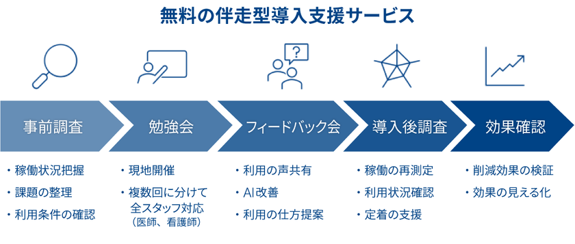 「OPTiM AI ホスピタル」導入から効果検証まで一気通貫を無償でサポートします。医師・看護師を分けての勉強会開催など、日々の業務に影響をきたさない柔軟な支援が可能です。導入効果測定と運用定着課題の改善提案を含む包括的支援をご提供します。