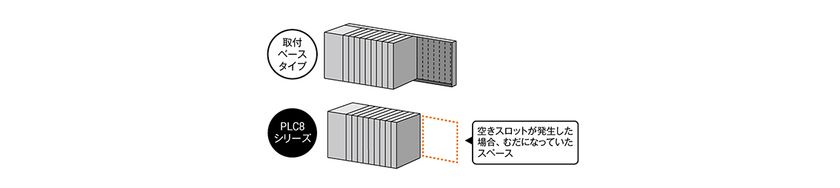 必要な入出力カードのみでシステムを構築できるため、従来の取付ベース型で発生しがちだった空きスロットのむだなスペースを削減します。