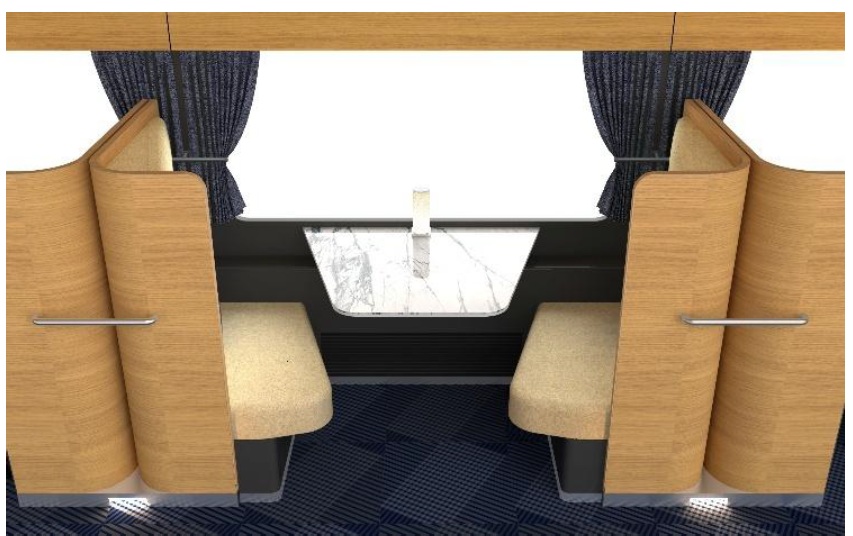 ・フレンチ膳を味わいながら車窓を楽しめるように、窓1つに対して各席を斜め向きに配置します。