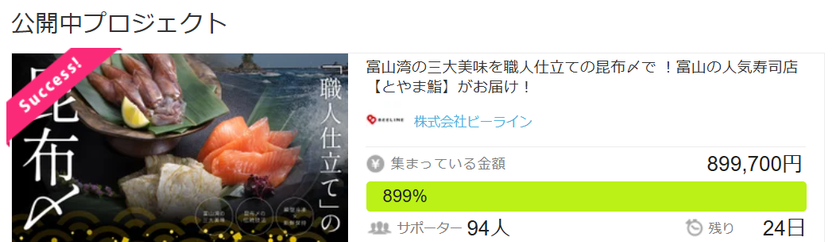 株式会社ビーライン(本社:富山県富山市、代表取締役:大坪 悟)は、富山で人気の寿司店「とやま鮨」の特別商品をお届けするプロジェクトを、応援購入サービス「Makuake」にて公開し、開始1日で目標金額700%を達成いたしました。