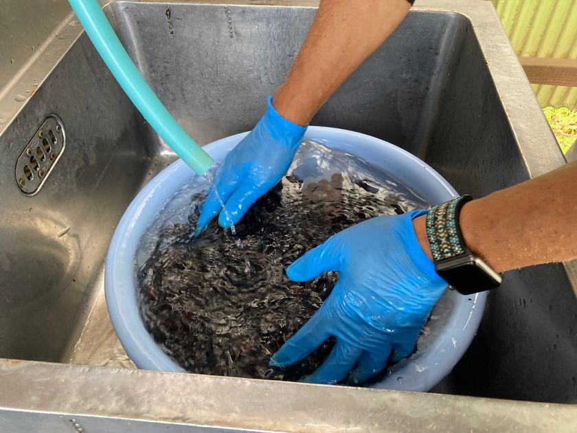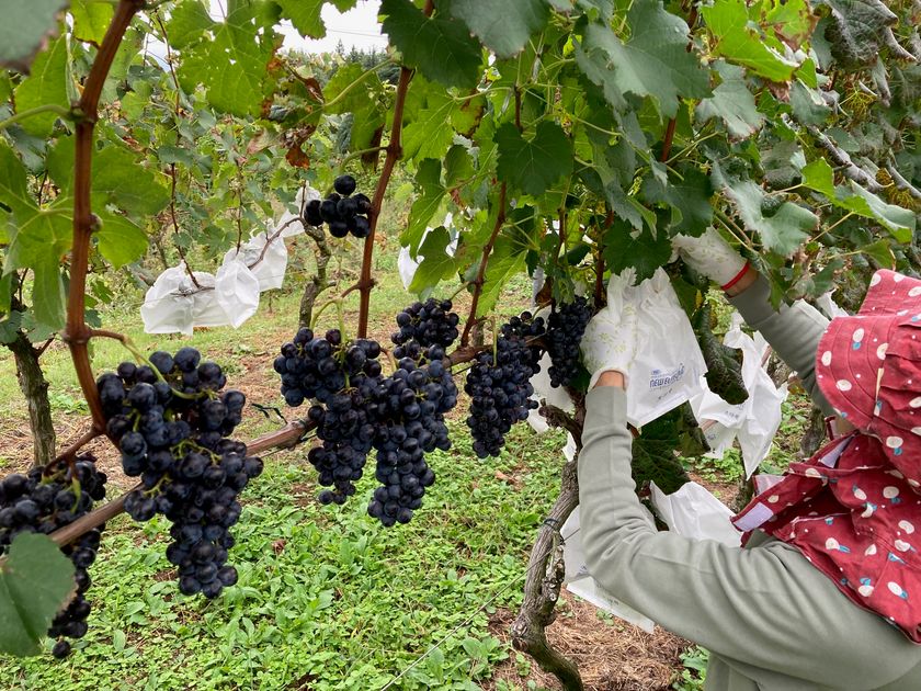 長野県・小諸市の浅間山麓の自家畑で育てた、ワイン用ぶどう・メルロー種を、ひと房ひと房を手摘みし、熟しきった"良いぶどうだけ"を丁寧に選別しました。