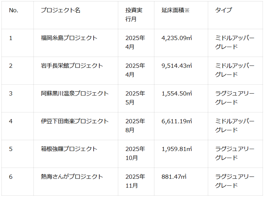 当社は、2025年4月より全国のホテル・旅館等への投資を開始し、国内機関投資家、金融機関等の協力を得ながら、2027年3月期までに全国のホテル・旅館等へ300億円の投資を行っていく予定です。