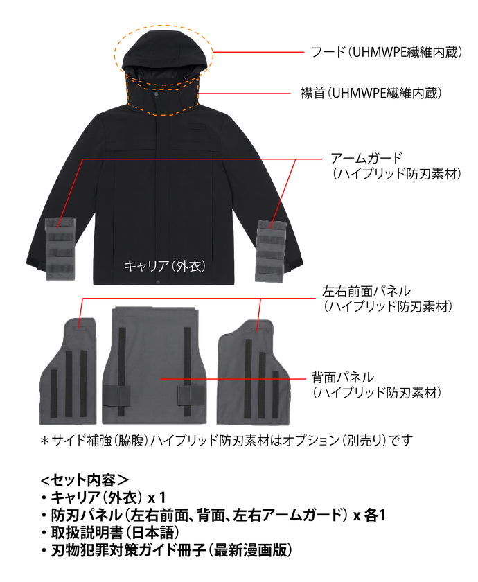 「SSPジャケット」は、そうした固定概念を覆す"普段着の延長線上にある防犯ウェア"として開発されたものです。先行して発表された「SSPインナーベスト」がクラウドファンディングで達成率449%を記録し大きな反響を得たことを受け、ユーザーの要望が多かった「首や頭部まで守れる防刃ウェア」として冬季向けジャケットタイプを新たに展開。日常生活に防刃性能を取り入れる新しい選択肢として注目を集めています。