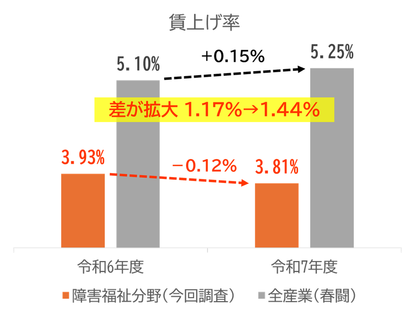 しかしながら、賃上げ率は、全産業(春闘)が前年度比0.15%増となっているなか、障害福祉分野は0.12%減となり、全産業との賃金格差は拡大しています(図2)。