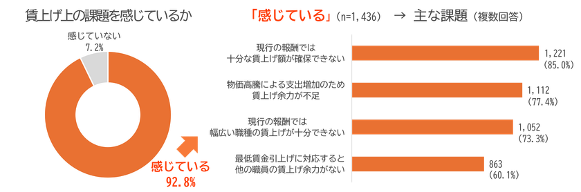 回答事業所の92.8%が賃上げを行う上での課題を感じていることがわかりました。