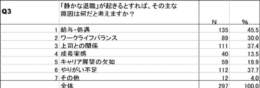 静かな退職が起きる原因について質問をしたところ、次のような回答となりました。