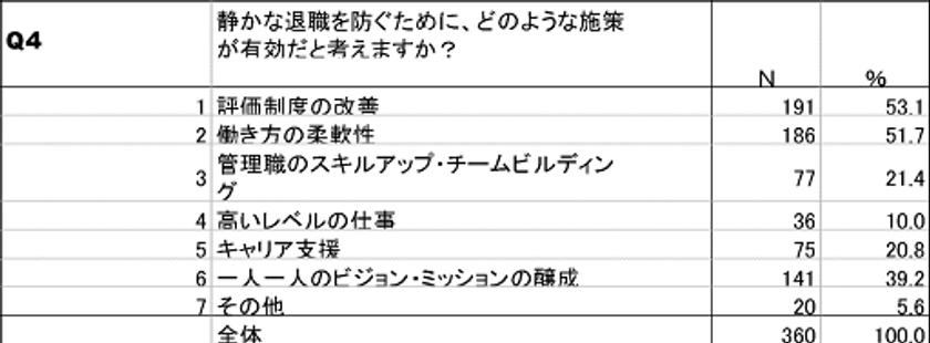 最後に、静かな退職が起こらないための施策について質問をしたところ、次のような回答となりました。