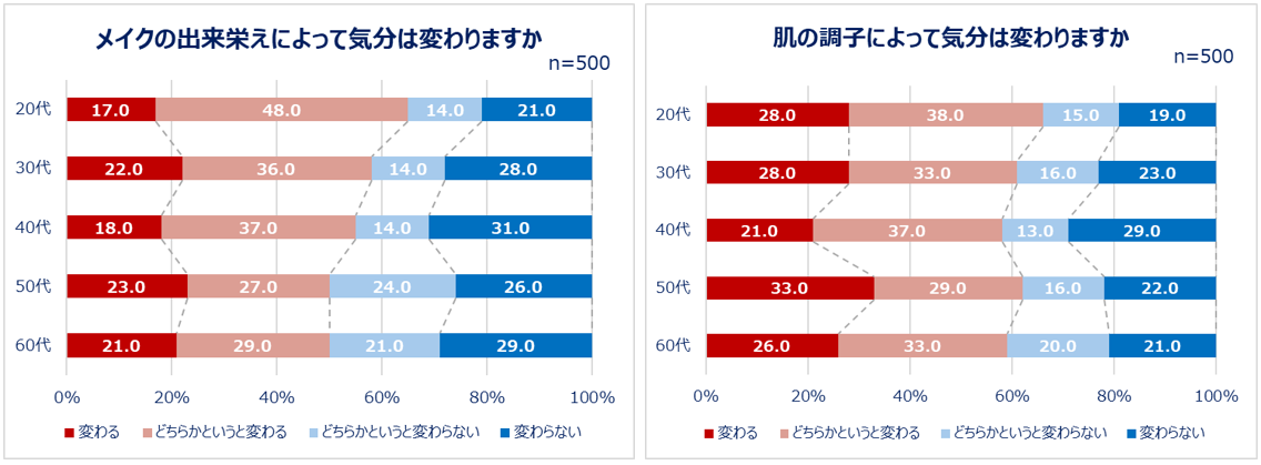 ビューティーが気持ちにも影響することを受けて、メイクの出来栄えや肌の調子によって気分が変わるかを聞いたところ、特に20代に気分が変わる人が多いことが分かりました。