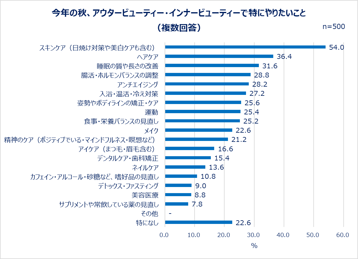 最後に、今年の秋、アウタービューティー・インナービューティーで特にやりたいことを聞きました。1位は「スキンケア(日焼け対策や美白ケアも含む)(54.0%)」、2位は「ヘアケア(36.4%)」、3位は「睡眠の質や長さの改善(31.6%)」でした。アウタービューティー領域にも、インナービューティー領域にも票が入り、内側からも外側からも美しくなりたい女性たちの心情がうかがえる調査結果となりました。